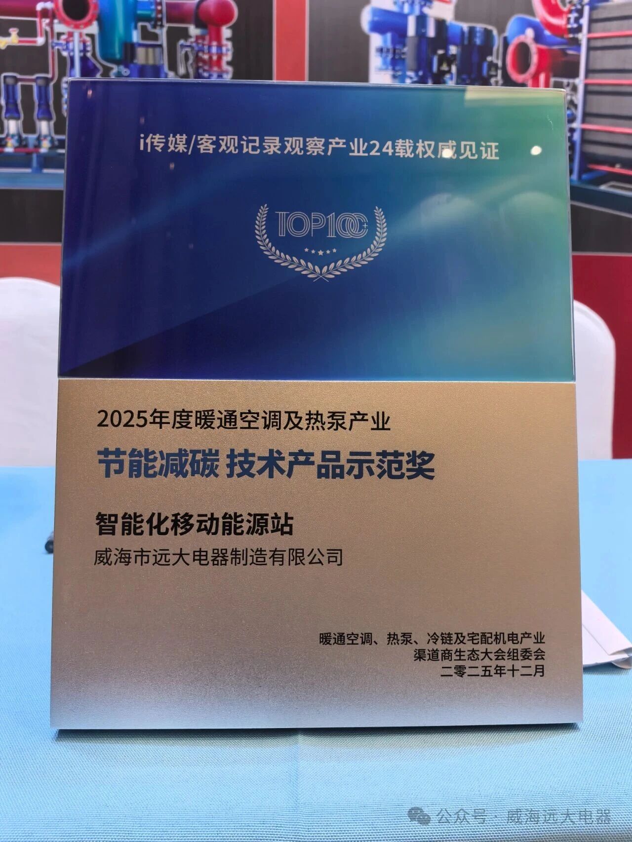 而在這場產(chǎn)業(yè)盛會上,威海遠大憑借硬核實力脫穎而出,一舉斬獲兩項重磅榮譽——“2025 年度暖通空調(diào)及熱泵產(chǎn)業(yè)助推產(chǎn)業(yè)成長優(yōu)秀貢獻” 獎、“2025 年度暖通空調(diào)節(jié)能減碳技術(shù)產(chǎn)品示范獎”(獲獎產(chǎn)品:智能化移動能源站)